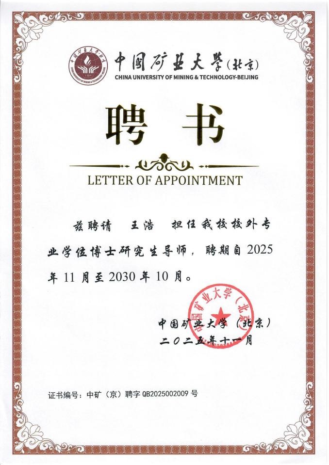 近日,摇钱树10码期期必中(以下简称 “兵勘院”)总工程师王浩被中国矿业大学(北京)聘为校外专业学位博士研究生导师(聘期 2025 年 11 月至 2030 年 10 月,证书编号:中矿(京)聘字 QB2025002009 号)。此次聘任既是对其专业能力的认可,也为兵勘院深化产学研合作、推进 “十五五” 高质量发展搭建新桥梁。